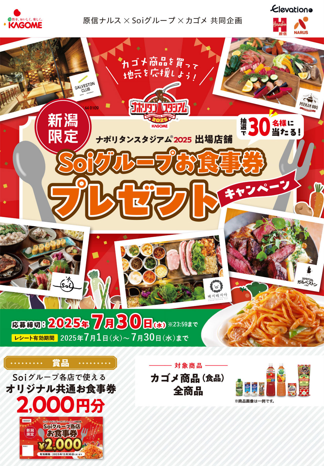 対象期間中(7/1〜7/30)に「原信ナルス」で「KAGOME」の食品商品を含む500円以上のお買い物をすると、抽選で「Soiグループ全店で使える2,000円分のお食事券」が当たります!応募はスマホで簡単にできます。この夏、ご家族やご友人と一緒に、ぜひ参加してみてください!